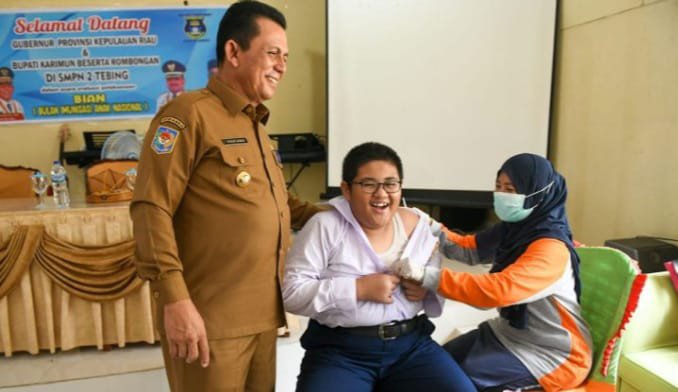 Usai evaluasi, Gubernur Kepri Ansar Ahmad dan rombongan meninjau langsung pelaksanaan penyuntikan imunisasi dalam BIAN tahun 2022 di SDN 003 dan SMPN 2 Kecamatan Tebing, Karimun