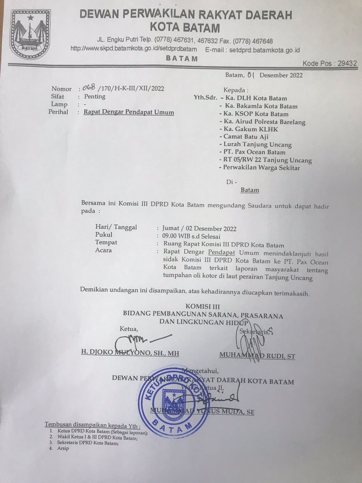 Undangan RDPU DPRD Batam soal laporan masyarakat terkait tumpahan oli kotor di perairan Tanjunguncang. (Foto: Dok DPRD)