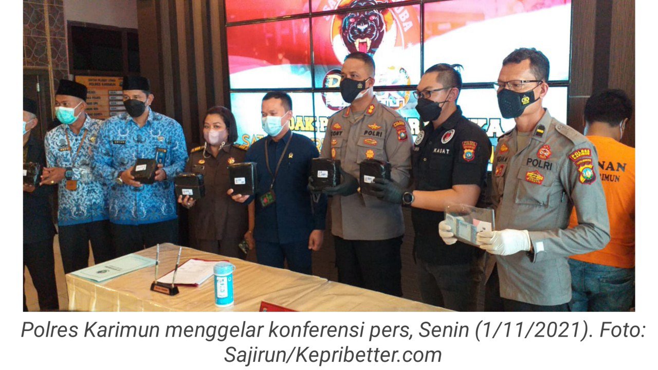 KEPRIBETTER.COM, KARIMUN – Polres Karimun menggelar konferensi pers penangkapan 6 kg sabu sekaligus pemusnahan barang bukti 1 kg di Mapolres Karimun, Senin (1/11/2021).