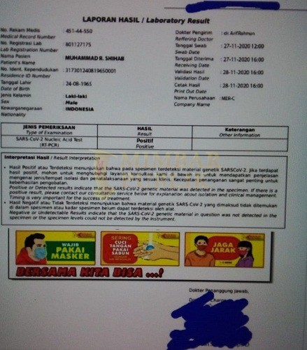 KEPRIBETTER.COM,Jakarta – Sejak kabur dari RS Ummi Bogor, Jawa Barat, Rizieq Shihab belum juga mengumumkan kondisi kesehatannya terkait dengan hasil tes usap Covid-19. Rabu (2/12/20) pagi beredar dokumen yang disebut hasil tes swab pemimpin FPI Habib Rizieq. Dokumen itu menunjukkan hasil swab Habib Rizieq adalah positif virus Corona (COVID-19).
