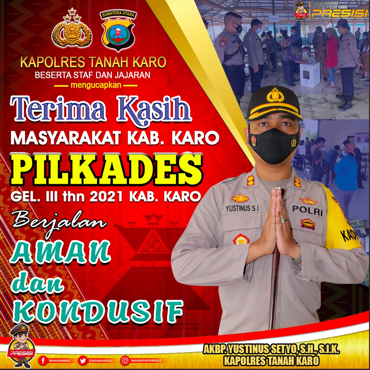 “Kami kawal mulai dari tahap perencanaan sampai dengan pelantikan calon terpilih guna mewujudkan situasi keamanan dan ketertiban yang kondusif,” ungkap Kapolres Tanah Karo AKBP Yustinus Setyo SH Sik (01/12/2021).