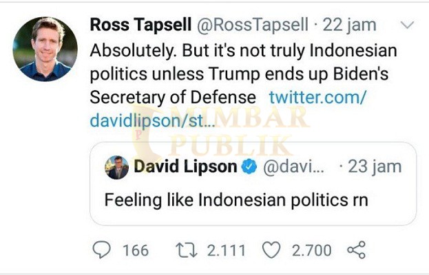 “Benar. Tapi itu bukan politik Indonesia yang sebenarnya kecuali Trump akhirnya menjadi Menteri Pertahanan Biden,” cuit Tapsell, mengomentari pernyataan Lipson.