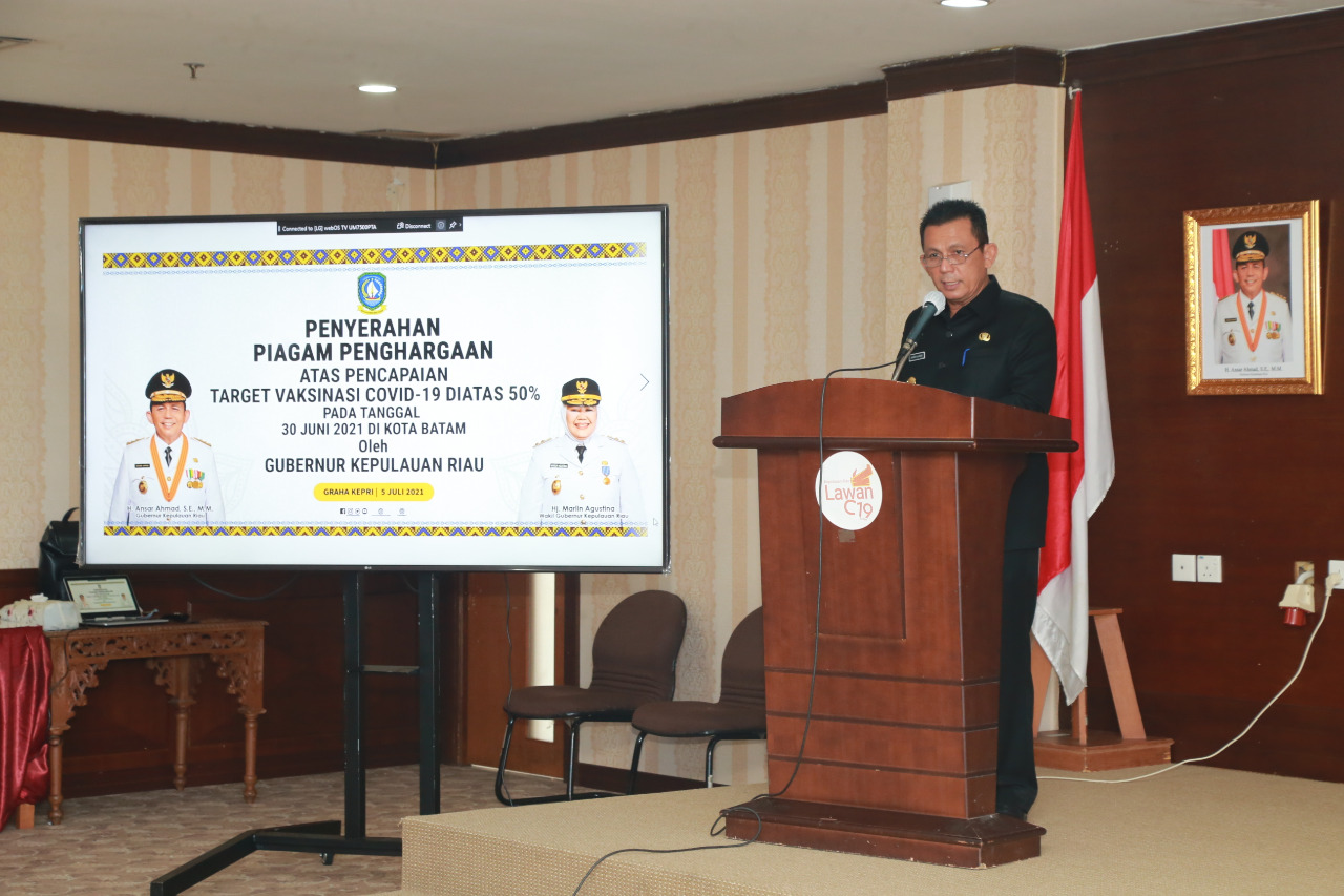 KEPRIBETTER.COM, Batam – Gubernur Kepulauan Riau (Kepri), Ansar Ahmad, memberikan piagam penghargaan atas pencapaian target Vaksinasi Covid-19 di atas 50 persen di Kota Batam kepada Pangkalan TNI Angkatan Udara (Lanud) Hang Nadim Batam.