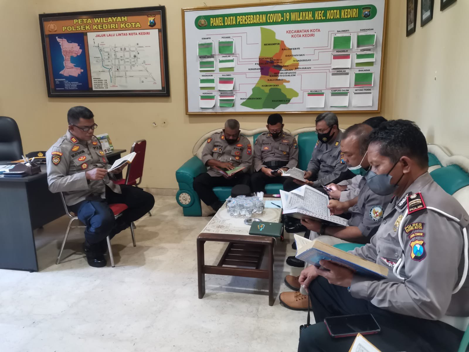KETERANGAN FOTO: Anggota polrea kediri kota saat membaca alquran di ruang kerja, Selasa (5/4). Foto: Humas Polres