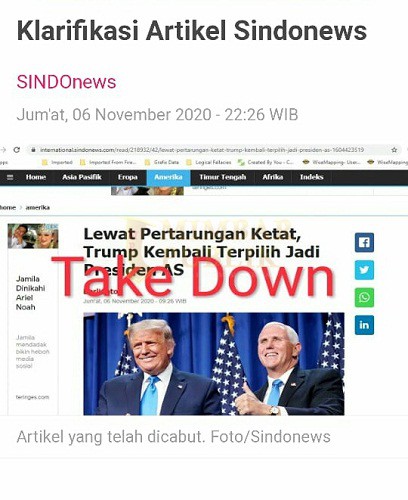 “Sehubungan dengan menyebarnya berita tentang kemenangan Donald Trump di sindonews.com yang berjudul: Lewat Pertarungan Ketat, Trump Kembali Terpilih Jadi Presiden AS, kami redaksi telah mencabut berita tersebut pada Jumat, 6 November 2020 pada pukul 10.30 WIB karena ada kekeliruan yang tidak disengaja.