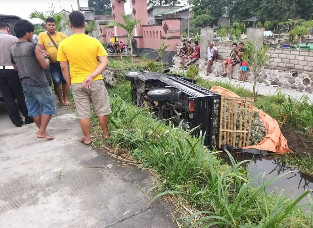 Mobil pickup dengan nomor polisi N 9195 YG, mengalami ban meletus hingga terperosok ke parit. Beruntung dalam insiden kecelakaan lalulintas itu tidak ada korban jiwa.