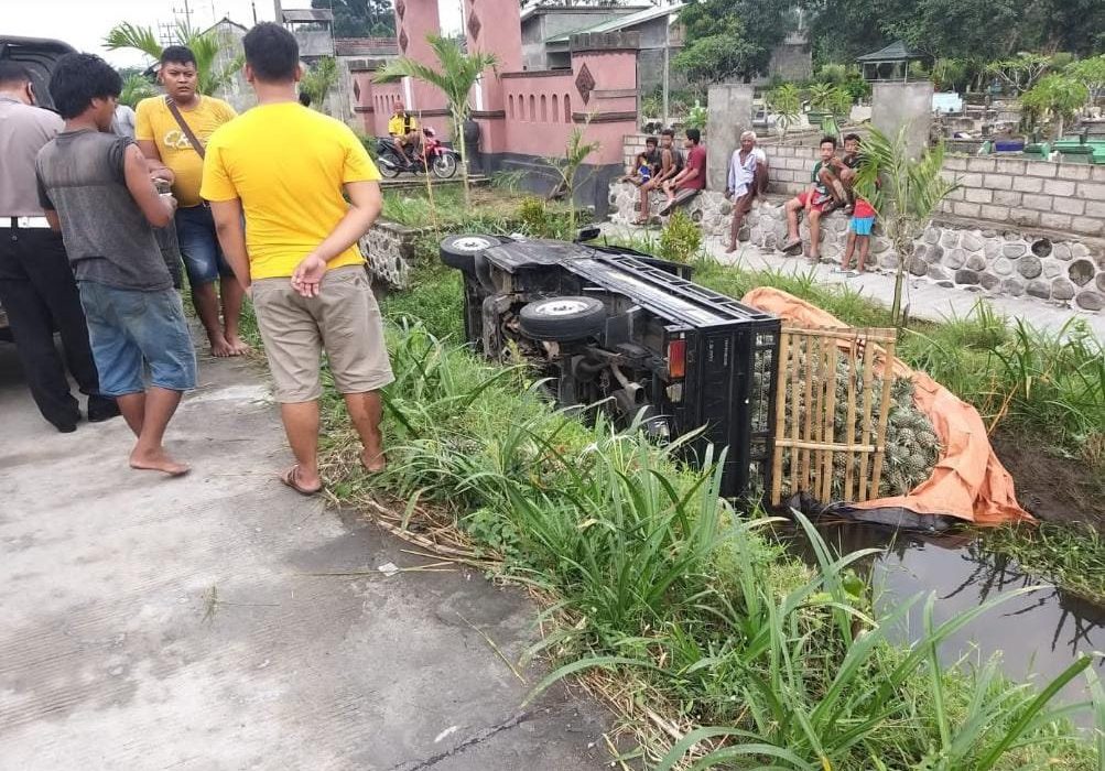 Mobil pickup dengan nomor polisi N 9195 YG, mengalami ban meletus hingga terperosok ke parit. Beruntung dalam insiden kecelakaan lalulintas itu tidak ada korban jiwa.