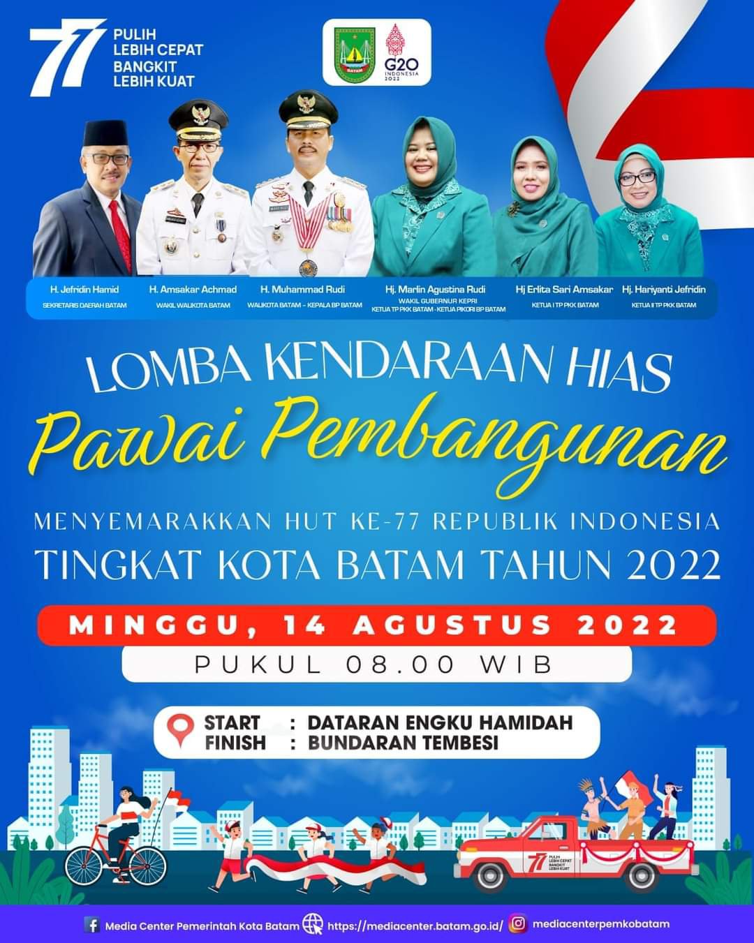 KEPRIBETTER.COM, BATAM – Semarakkan HUT ke-77 RI, Pemko Batam Gelar Lomba Kendaraan Hias Pawai Pembangunan- Pemko Batam menggelar lomba kendaraan hias pawai pembangunan, dalam rangka menyemarakan Hari Ulang Tahun (HUT) ke 77 Kemerdekaan Republik Indonesia.