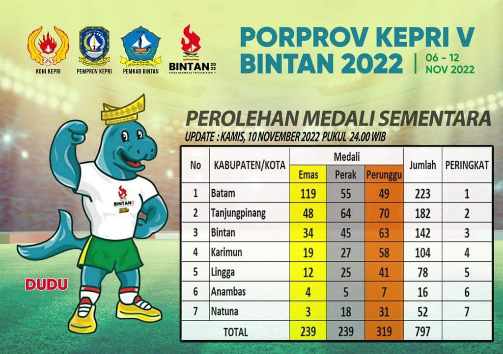 Data dari Porprov Provinsi Kepri 2022, kontingen Kota Batam masih menjadi pengumpul mendali paling banyak. Hingga Kamis malam (10/11/2022) pukul : 24.00 wib, Kota Batam yang dipimpin Wali Kota Batam Muhammad Rudi, berhasil Mengumpulkan 223 mendali meliput 119 mendali emas, 55 mendali perak dan 49 mendali perunggu.