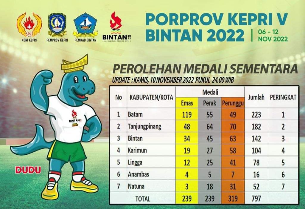 Data dari Porprov Provinsi Kepri 2022, kontingen Kota Batam masih menjadi pengumpul mendali paling banyak. Hingga Kamis malam (10/11/2022) pukul : 24.00 wib, Kota Batam yang dipimpin Wali Kota Batam Muhammad Rudi, berhasil Mengumpulkan 223 mendali meliput 119 mendali emas, 55 mendali perak dan 49 mendali perunggu.