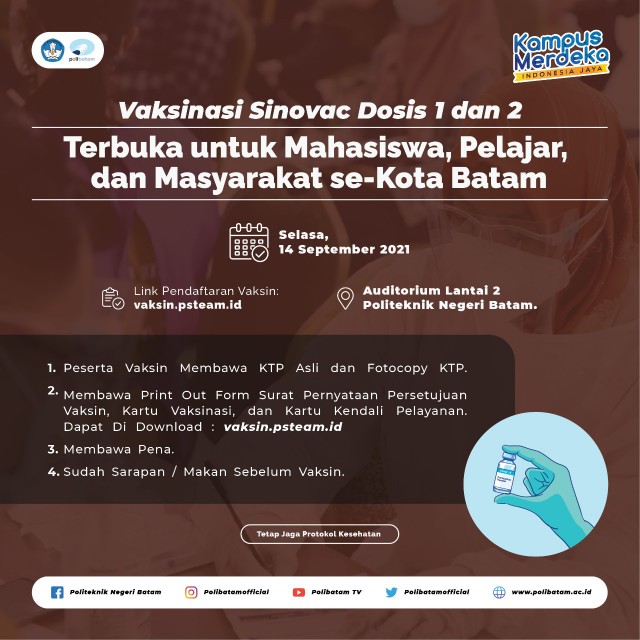 Adapun persyaratan untuk vaksin di Politeknik Negeri Batam adalah pertama, peserta vaksin membawa KTP asli dan fotocopy KTP.