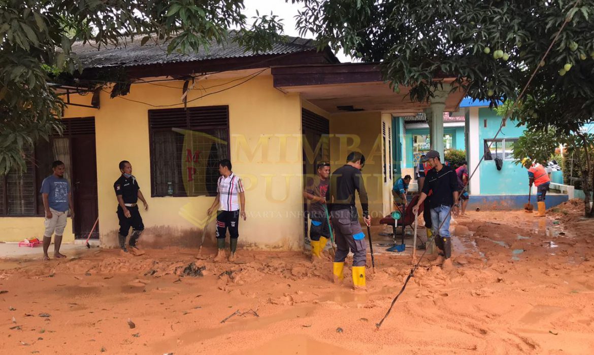 Fauzi Anwar, beserta anggotanya bersekuku menbersihkan lumpur yang mengenangi halaman rumahnya.