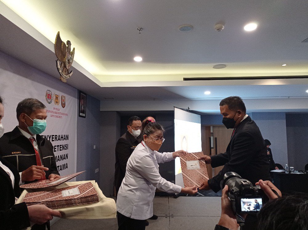 Penyerahan sertifikat kompetensi dilakukan oleh Komisioner BNSP, Tetty DS Hariyanto didampingi Direktur Utama PT TSSI, Irjen Pol (P) Drs Edward Aritonang MM sebagai penyelenggara pelatihan Satuan Pengamanan kualifikasi Gada Utama dan Direktur LSP P-2 Sekuriti PP Polri, Irjen Pol (P) Drs Istu Hari Winarto SH MH sebagai pelaksana buji kompetensi.