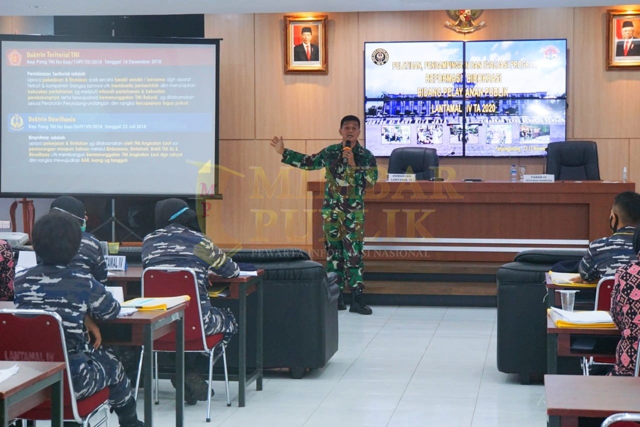 Danlantamal IV dalam sambutannya dibacakan oleh Wadanlantaal IV mengatakan, “Selama dua hari, melalui kegiatan Pelatihan, Pendampingan, dan Evaluasi Program Reformasi Birokrasi Bidang Pelayanan Publik TA. 2020 di Mako Lantamal IV ini, kita bersama-sama belajar mendapatkan pengetahuan, berdiskusi dan berbagi informasi mengenai program reformasi birokrasi bidang pelayanan publik,” sebutnya.