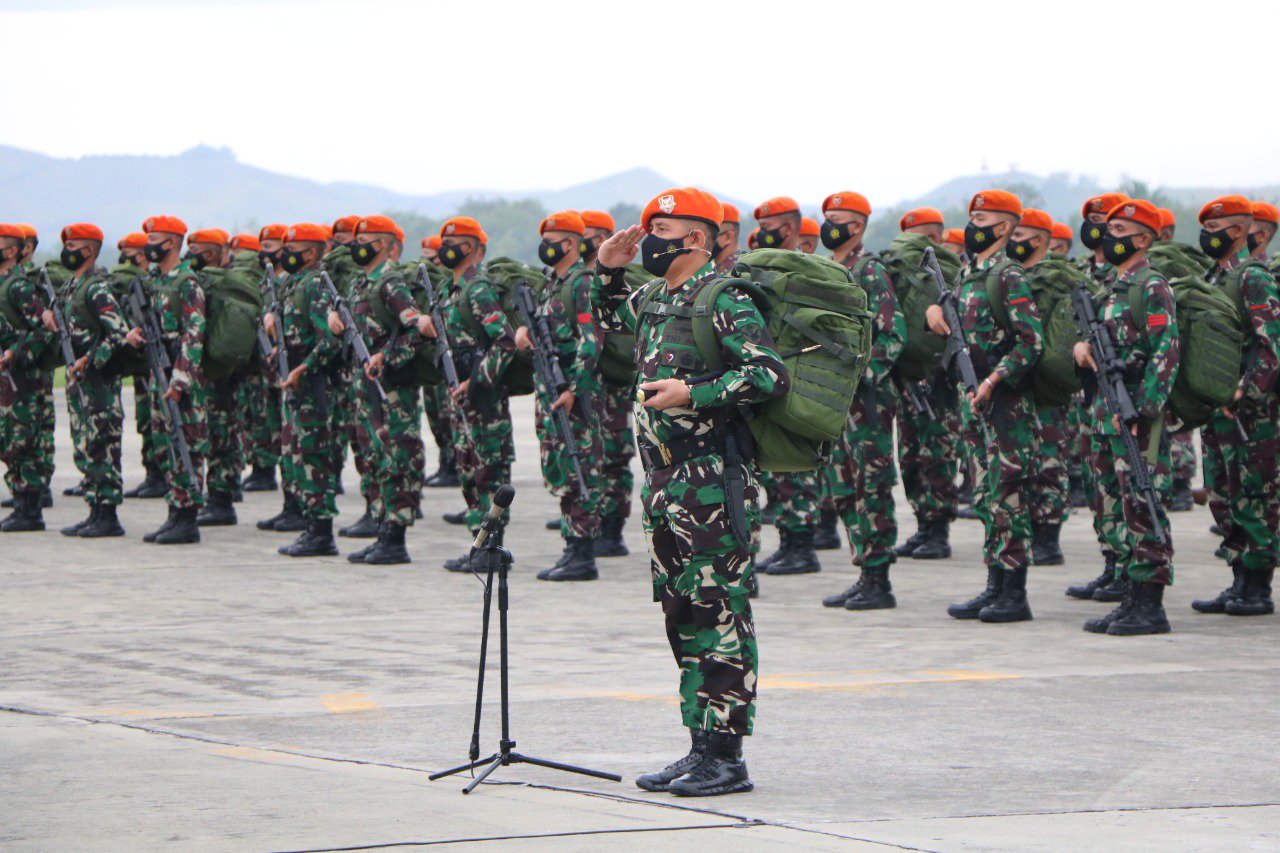 KEPRIBETTER.COM, Jayapura – Panglima Kodam XVII/ Cenderawasih Mayjen TNI Teguh Muji Angkasa memimpin Upacara Pelepasan Satgas Kopasgat BKO Pangdam XVII/Cend, di Apron Base Ops Lanud Silas Papare, Jayapura, Selasa (15/2).