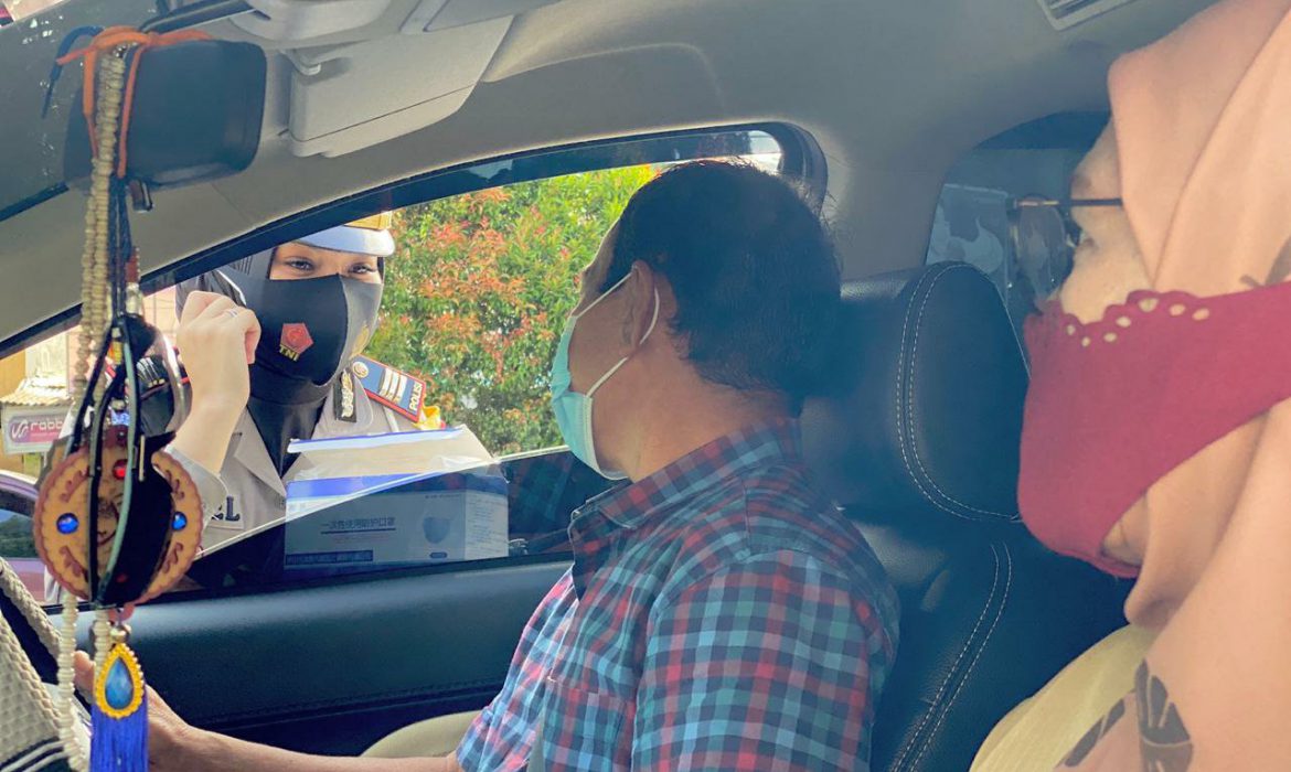 Akp Amalia Normadiah, SH, S.ik juga menambahkan bahwa selain membagi masker ia juga memasangkan stiker dikendaraan roda empat yang melintas di jalan jendral sudirman.