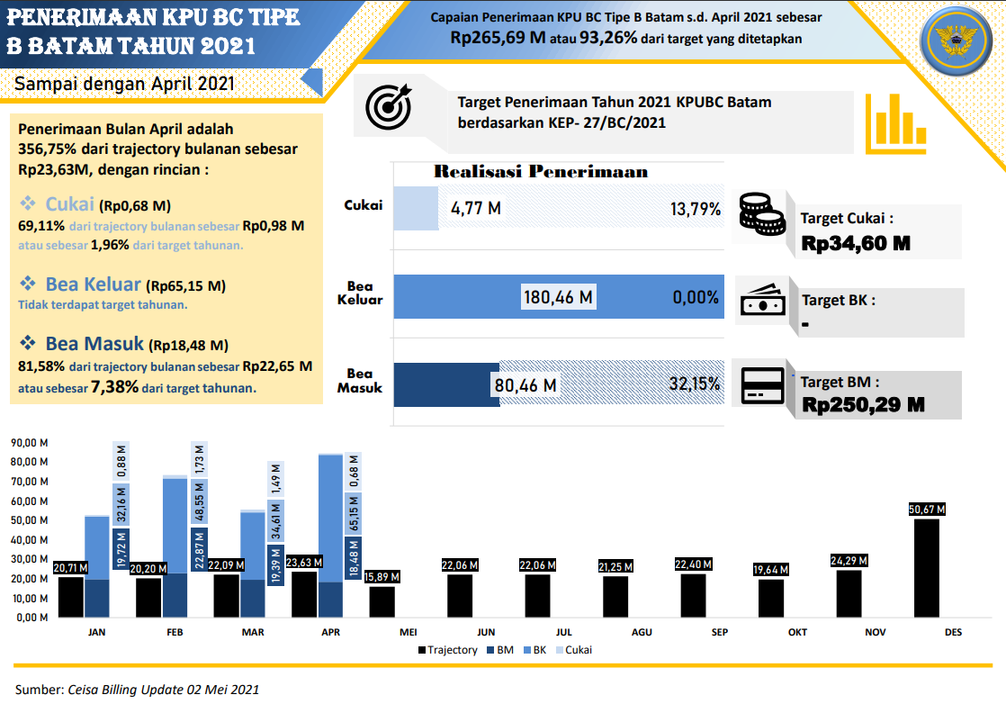 “Berdasarkan data yang dihimpun dari CEISA Billing per 02 Mei 2021, keseluruhan penerimaan Bea Cukai Batam hingga bulan April yaitu bea masuk sebesar Rp80,46 miliar dari target Rp250,29 miliar, bea keluar sebesar Rp180,46 miliar dan cukai sebesar Rp4,77 miliar dari target Rp34,60 miliar,” kata Kepala Bidang Perbendaharaan dan Keberatan Bea Cukai Batam, Akbar Harianto, Selasa (18/5/2021).