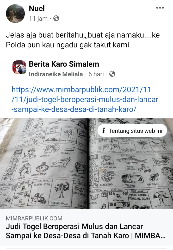 Judi Togel Marak di Karo, Akun FB Nuel Tantang Media