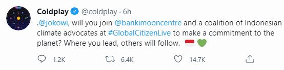 “Jokowi, maukah kamu bergabung dengan @bankimooncentre dan koalisi penggiat iklim Indonesia di #GlobalCitizenLive dan membuat komitmen untuk bumi? Anda memimpin, maka yang lain akan mengikuti,” cuit Coldplay.