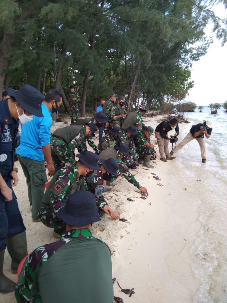 Menambahkan, Selain pembagian sembako, juga dilakukan penanaman pohon mangrove dan pelepasan tukik di kawasan pantai wisata Pulau karya, pemberian bingkai Kesan dan pesan Danjen Kopasus kepada Koramil 04/KS dan ditutup dengan Photo bersama.