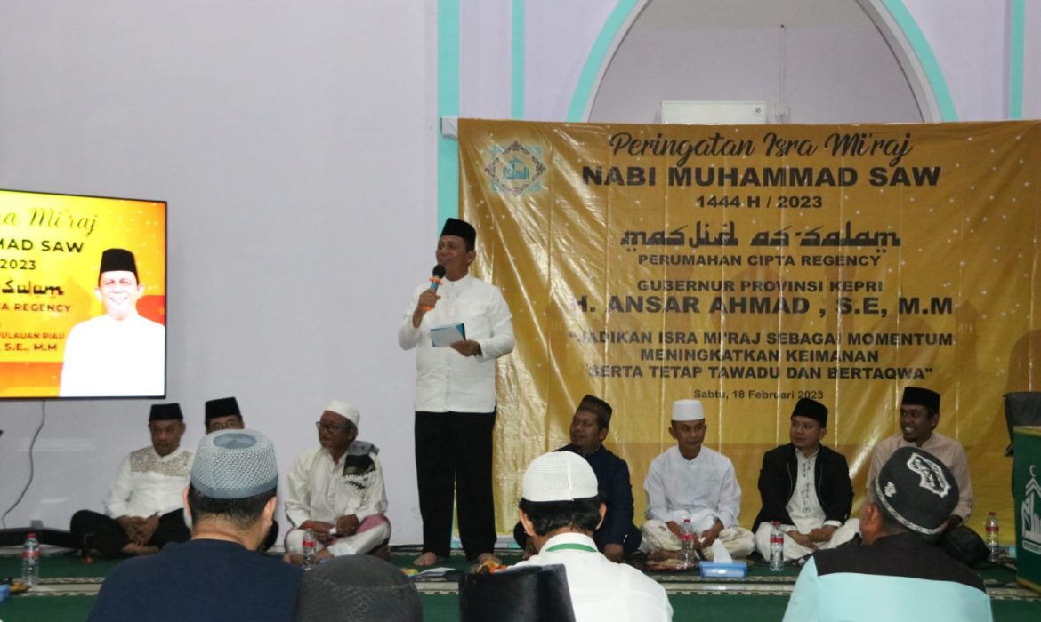 KEPRIBETTER.COM, BATAM – Gubernur Kepulauan Riau H. Ansar Ahmad menghadiri Peringatan Isra’ Miraj Nabi Besar Muhammad SAW 1444 H 2023 M di Masjid As-Salam Perum Cipta Regency, Batam, Sabtu (18/02) malam.