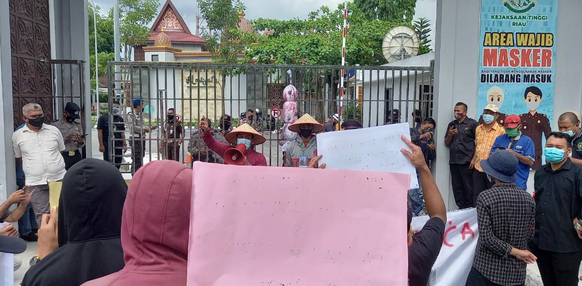 KEPRIBETTER.COM, Pekanbaru – Mahasiswa yang tergabung dalam Aliansi Mahasiswa Peduli Petani Riau (AMPeR) melakukan orasi dan pernyataan sikap di depan Kantor Kejaksaan Tinggi Riau, kamis (22/4/21).