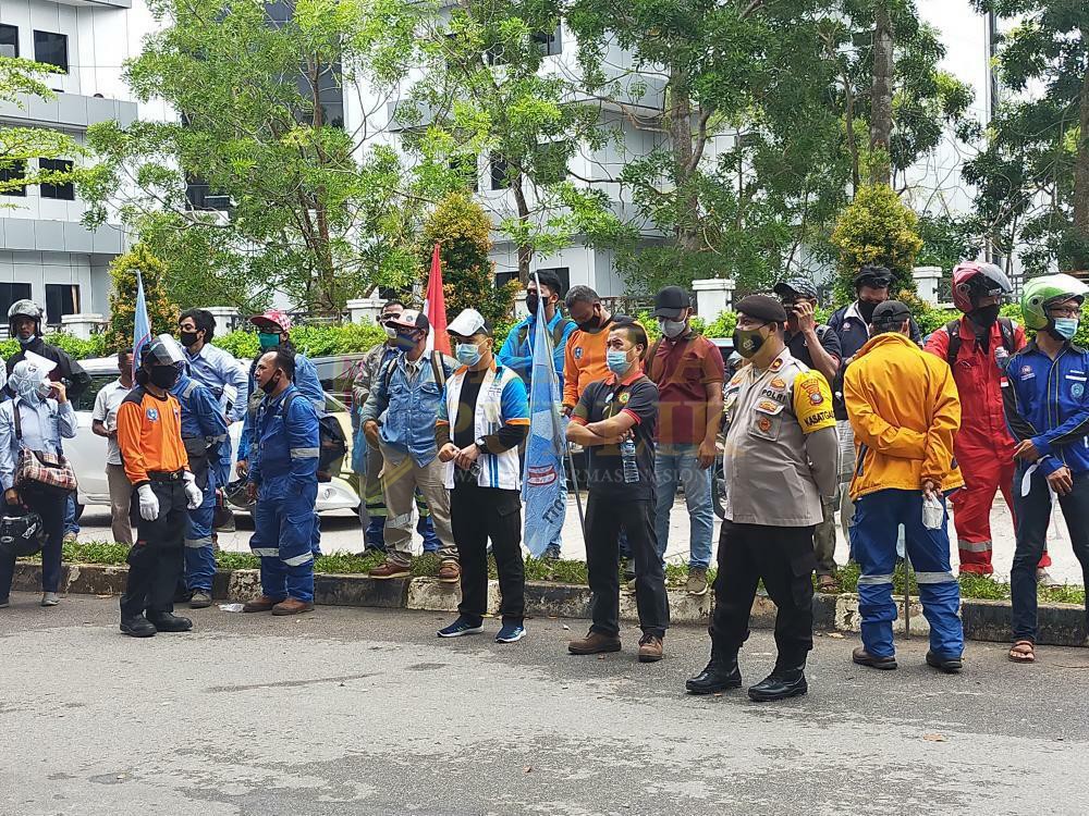 Kasat Sabhara Polresta Barelang Kompol Firdaus, S.Sos membaur bersama pengunjuk rasa dalam pengamanan kegiatan tersebut. / ft - hms)