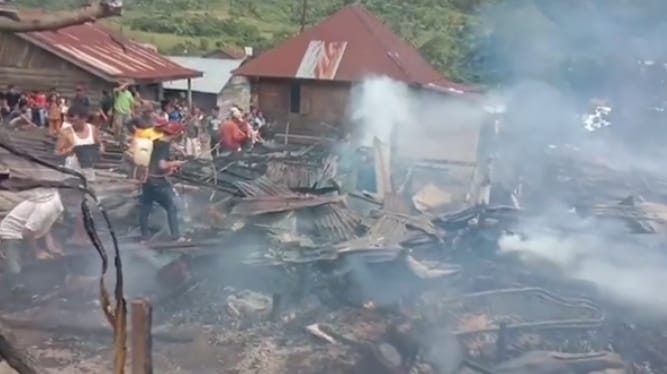 Kepala Desa dan Warga setempat bergagas bersama-sama melihat kejadian tersebut, Ternyata rumah warga sudah di lalap sijago merah.