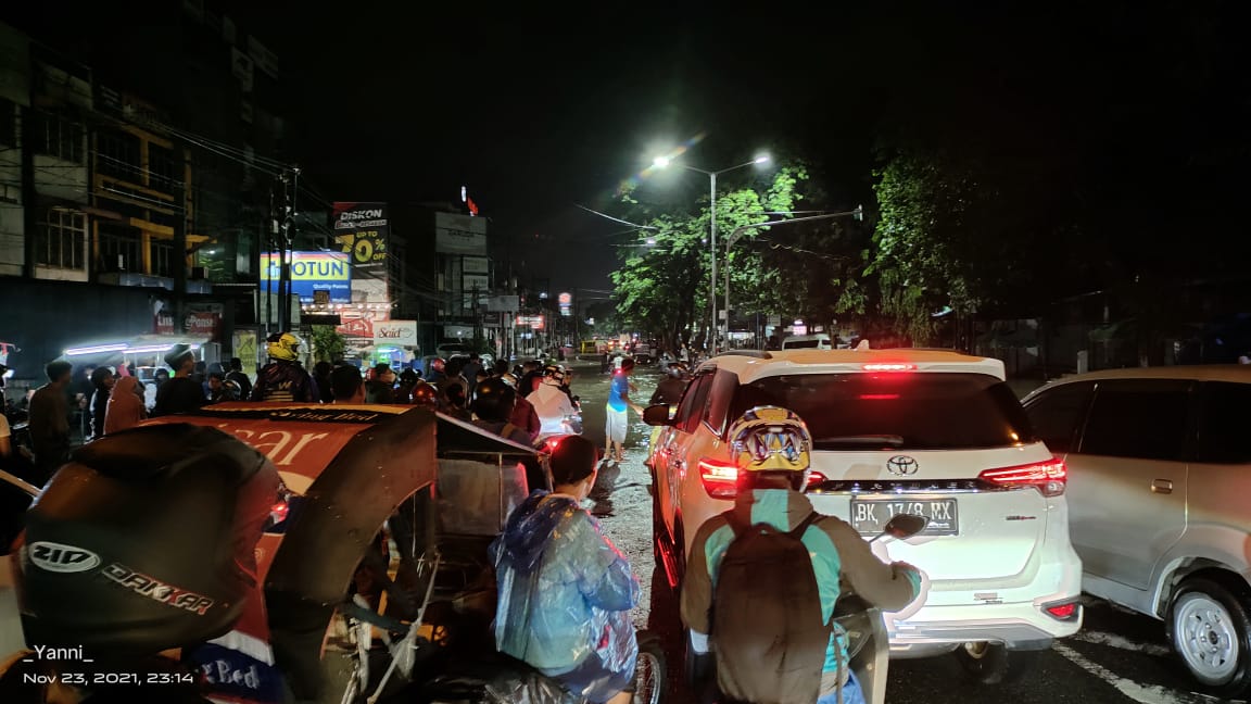 Tiga motor tim JKW-PWI terjebak banjir di Jalan Gatot Subroto, Medan, Selasa (23/11/21) malam. Foto: Dok JKW-PWI