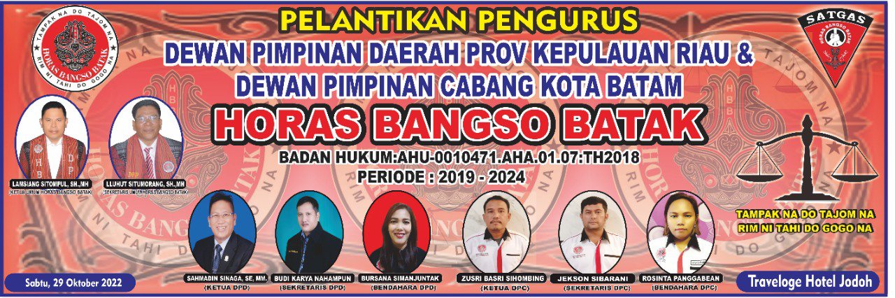 KEPRIBETTER.COM, BATAM – Pelantikan Horas Bangso Batak (HBB) Provinsi Kepri akan dilaksanakan di Hotel Travelodge ( eks Hotel Novotel) Jodoh Batam, rencananya akan dihadiri Ratusan pengurus dari berbagai tingkatan se-Kepri.