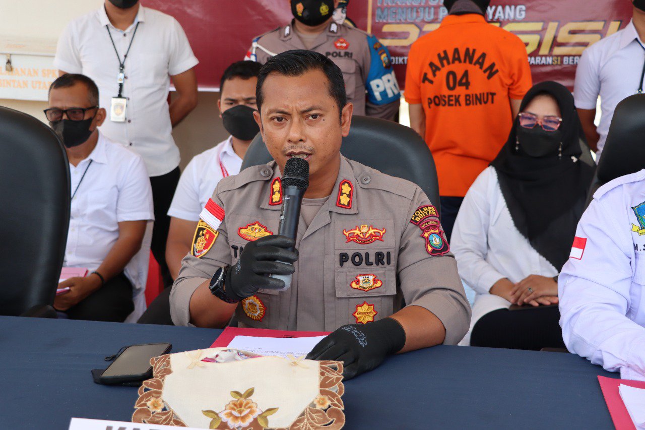 Kapolres Bintan AKBP Tidar Wulung Dahono, S.H., S.I.K., M.H saat konferensi pers di Polsek Bintan Utara didampingi oleh Kapolsek Binta Utara AKP Sopandi, Kabid Rehabilitasi dan Sosial Kabupaten Bintan Syaf Nur bersama tim pekerja sosial DinSos kabupaten Bintan menjelaskan bahwa penangkapan terhadap tersangka YK Als UW (48 Tahun) berdasarkan laporan dari para orang tua korban ke Polsek Bintan Utara pada tanggal 15 Juli 2022 lalu.