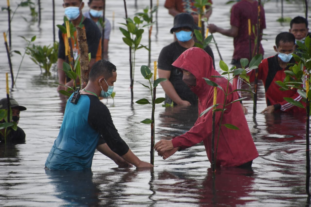 Saat itu, kondisi air juga tengah pasang sehingga lokasi penanaman terendam air. Tinggi air yang mencapai pinggang orang dewasa tak menyurutkan niat Kepala Negara untuk turun langsung menanam mangrove.