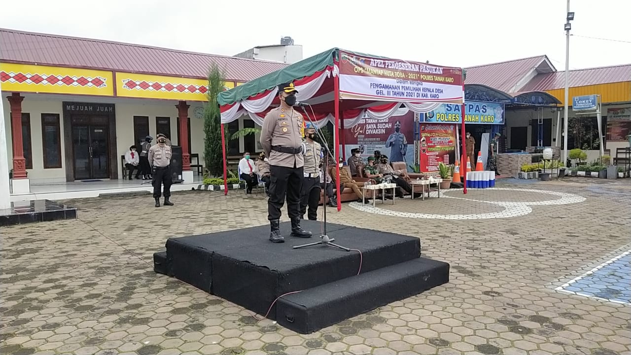 KEPRIBETTER.COM, Karo – Menjelang Pemilihan Kepala Desa Serentak yang akan dilaksanakan esok hari Selasa 30/11 Maka Jajaran Polres Tanah Karo menggelar Apel Pergeseran Pasukan “Ops Mantap Huta Toba 2021” Polres Tanah Karo dalam Rangka Pengamanan Pemilihan Kepala Desa Gel. III Tahun 2021 di Kabupaten Karo, Senin 29/ 11/ 2021, bertempat di Halaman Mapolres Karo, Jalan Veteran Kabanjahe.