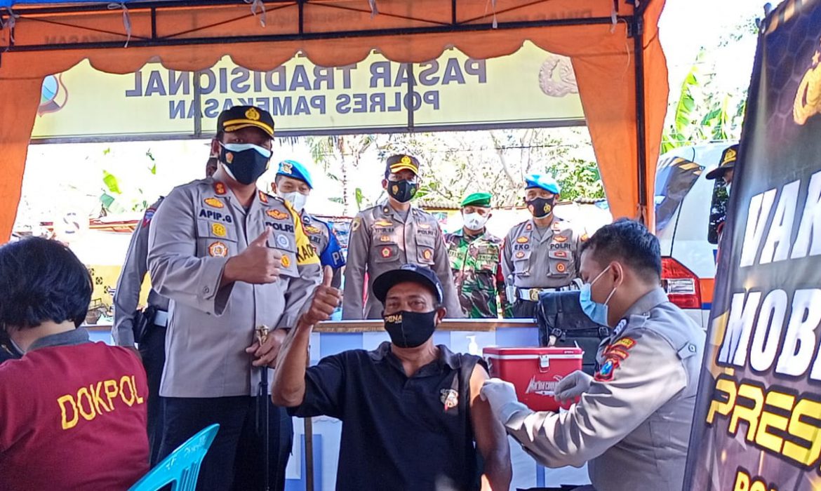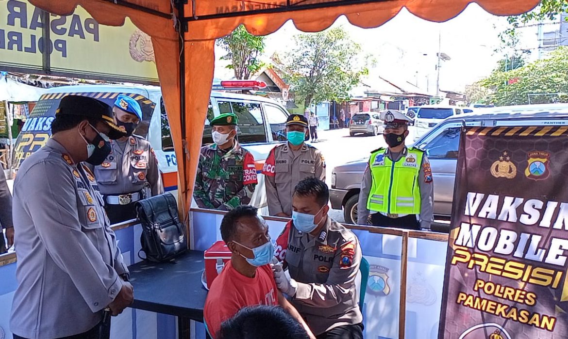 Pada kesempatan tersebut Kapolres Pamekasan AKBP Apip Ginanjar, S.I.K., M.Si bersama PJU Polres Pamekasan tinjau langsung giat Vaksinasi Mobile Presisi di Pasar Kolpajung yang dilakukan oleh Urkes Polres Pamekasan.